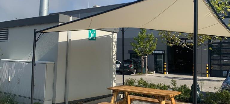 Wir setzen nicht nur auf Nachhaltigkeit, sondern auch auf Mieter-Zufriedenheit. Deshalb haben wir das "S" in ESG weiter mit Leben gefüllt. An zwei Standorten haben wir jetzt überdachte Sitzgruppen. Die geschützten Bereiche bieten die Möglichkeit, Pausen im Freien zu genießen, unabhängig von den Wetterbedingungen.