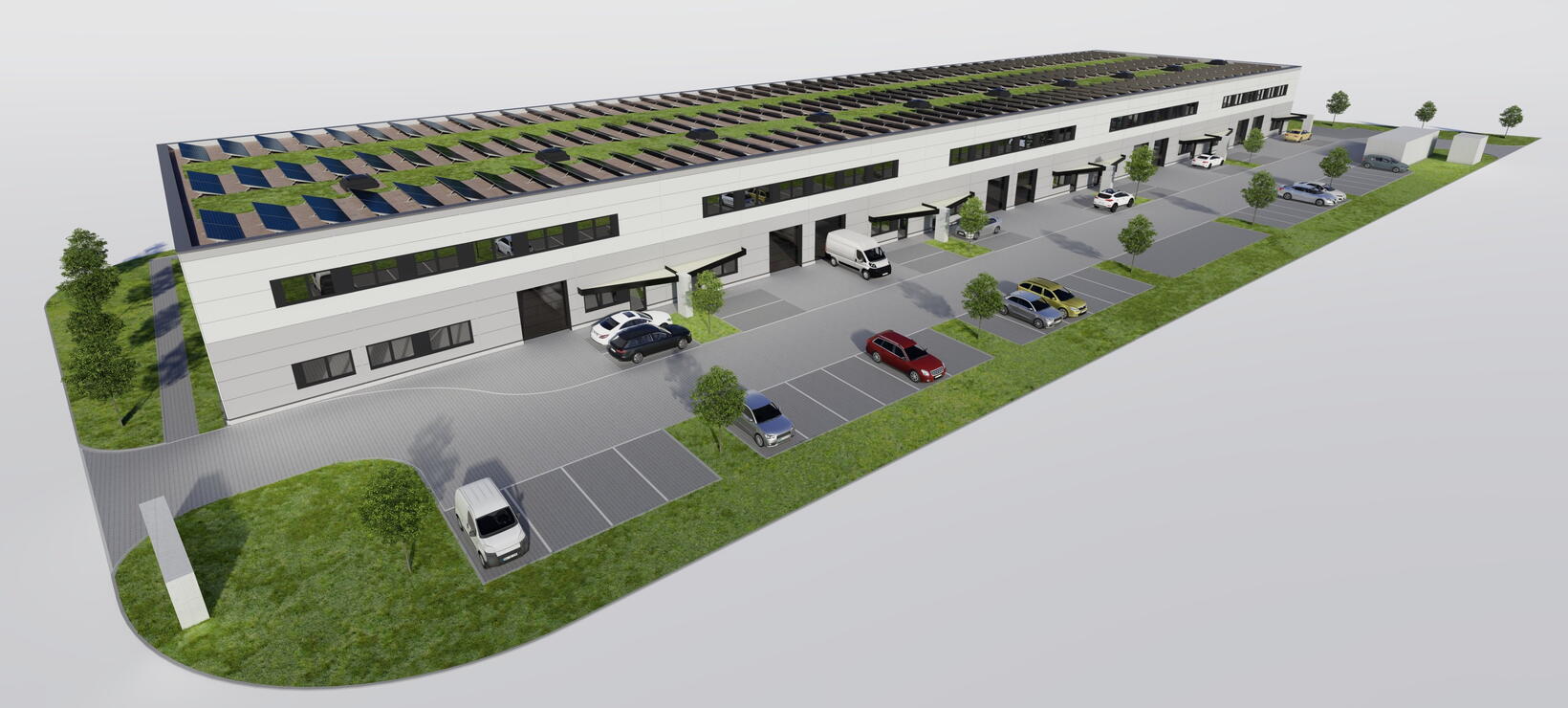 Neubau eines Gewerbepark mit einem Multifunktionsgebäude und modularen Ausstellungs-, Lager- oder Produktionsflächen.